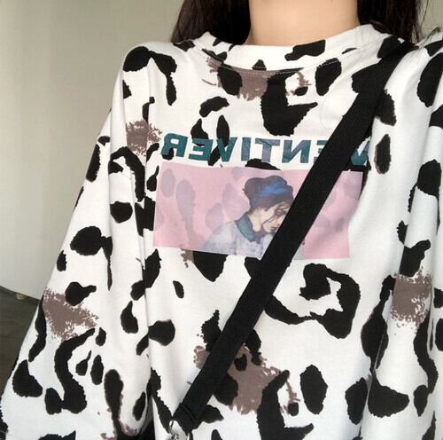 全2色 ロングTシャツ レオバード柄 アニマル柄 プリント カットソー 七分袖 ラウンドネック ドロップショルダー 韓国 オルチャン カジュアル