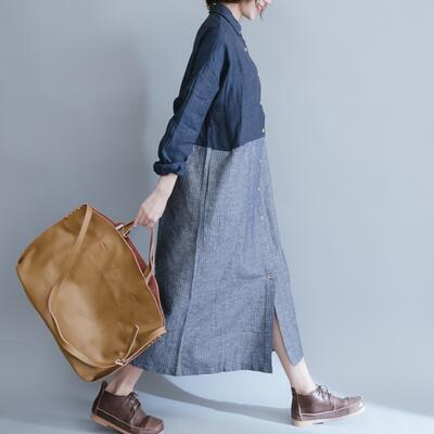 ワンピース おしゃれ 袖あり ロング丈 カジュアル 春 春夏 春秋 長袖 レディース シャツワンピ ダンガリー ワンピ ドレス シンプル 切り替え 前開き リラックス ナチュラル 体型カバー ゆったり 大きいサイズ ネイビー 紺 20代 30代 40代 50代