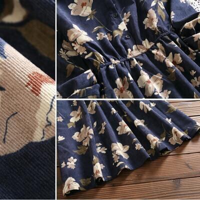 全2色 ワンピース 袖あり ロング丈 ミモレ丈 カジュアル 春 春夏 春秋 長袖 おしゃれ レディース 可愛い クラシカル 花柄 ワンピ ドレス 上品 レトロ お出かけ Aライン ハイウエスト 大きいサイズ ネイビー 青 イエロー 黄 20代 30代 40代 50代