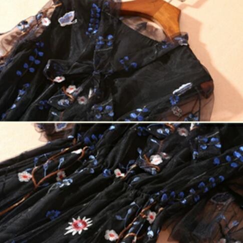 ワンピース 袖あり ロング丈 マキシ丈 カジュアル エレガント 春 春夏 春秋 長袖 半袖 五分袖 おしゃれ レディース 可愛い リボン ワンピ ハイウエスト ドレス Aライン フェミニン 花柄 刺繍 透け感 大きいサイズ ブラック 黒 20代 30代 40代 50代
