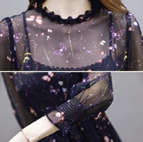 ワンピース 袖あり ロング丈 ミモレ丈 カジュアル エレガント 春 春夏 春秋 シフォン 長袖 おしゃれ レディース 可愛い ワンピ ドレス Aライン フェミニン バタフライ 透け感 大きいサイズ ダークパープル 紫 20代 30代 40代 50代