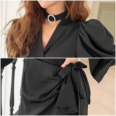 全2色 春夏 結婚式 ワンピース 袖あり 7分袖 ひざ丈 フォーマル エレガント シック Vネック クロスサイドレース フィット スリム ウエストパフスリーブ バッグヒップ ワンピ ドレス ロングスカート ブラック 黒 20代 30代 40代 50代