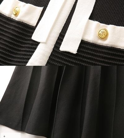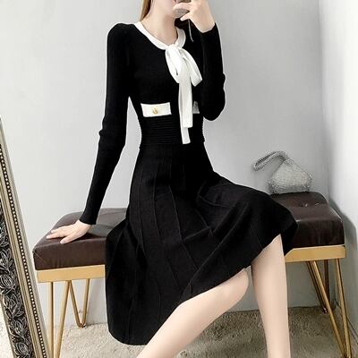 ワンピース ニットワンピース レディース 春秋 長袖 カジュアル おしゃれ Aライン ひざ下丈 ミディ丈 ボウタイネック リボン プリーツ 大人可愛い きれいめ 上品 エレガント バイカラー ブラック 黒 20代 30代 40代 50代